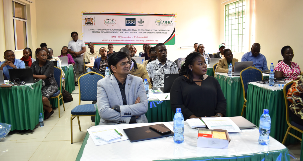 The International Rice Research Institute (IRRI) participated in KALRO’s five-day capacity-building program, held from 29 September to 3 October at the KALRO Mwea Centre in Kirinyaga County, Kenya, where it delivered a live demonstration of the Enterprise Breeding System (EBS) alongside other digital solutions. The training enhanced the capabilities of Kenya’s rice research team in Early Generation Seed (EGS) production, experimental design, agronomic trial management, experiment creation and oversight, digital data collection and analysis, and modern breeding techniques. Representatives from the Kenya Agricultural and Livestock Research Organization (KALRO), the Mwea Rice Growers Multipurpose Cooperative Society (MRGM), and the National Irrigation Authority – Mwea Irrigation Agricultural Development Centre (NIA–MIAD) also took part in the program.